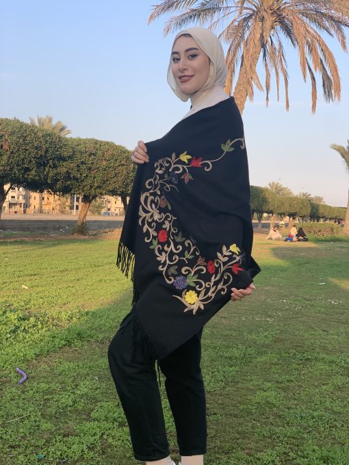 A wide English wool shawl (185 cm x 65 cm) adorned with intricate handmade floral embroidery using premium silk and wool threads. This unique piece is carefully crafted by Egyptian artisans, blending warmth and elegance in one design.
