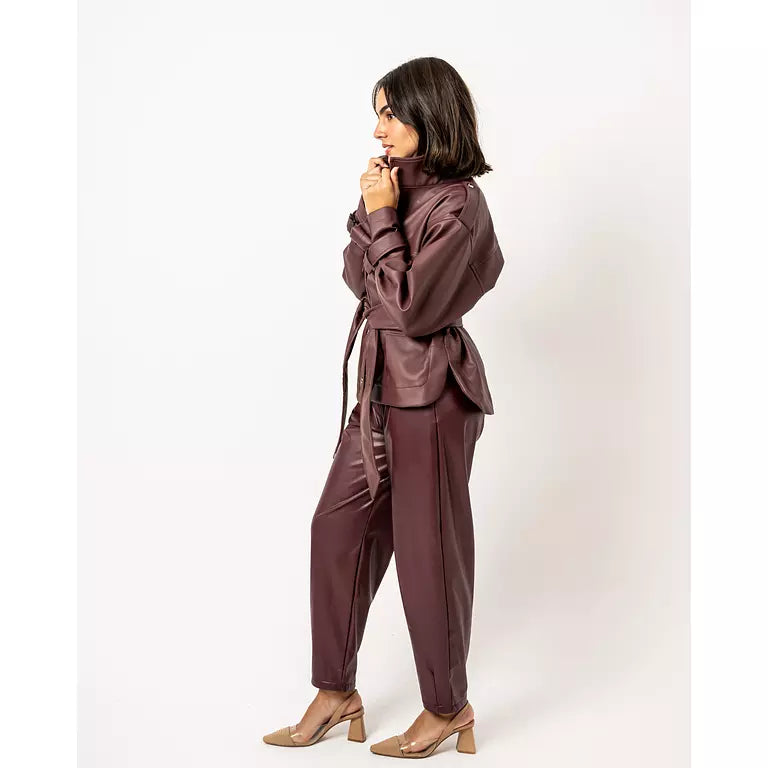 Our burgundy love outfit of leather chemi-jacket and wide leg pants. A monochromatic look that is not a nude color.