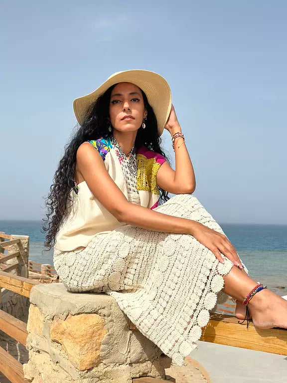 Model is wearing size one size fit up to XL, elastic waist, skirt length is 100cm, model size is M.
