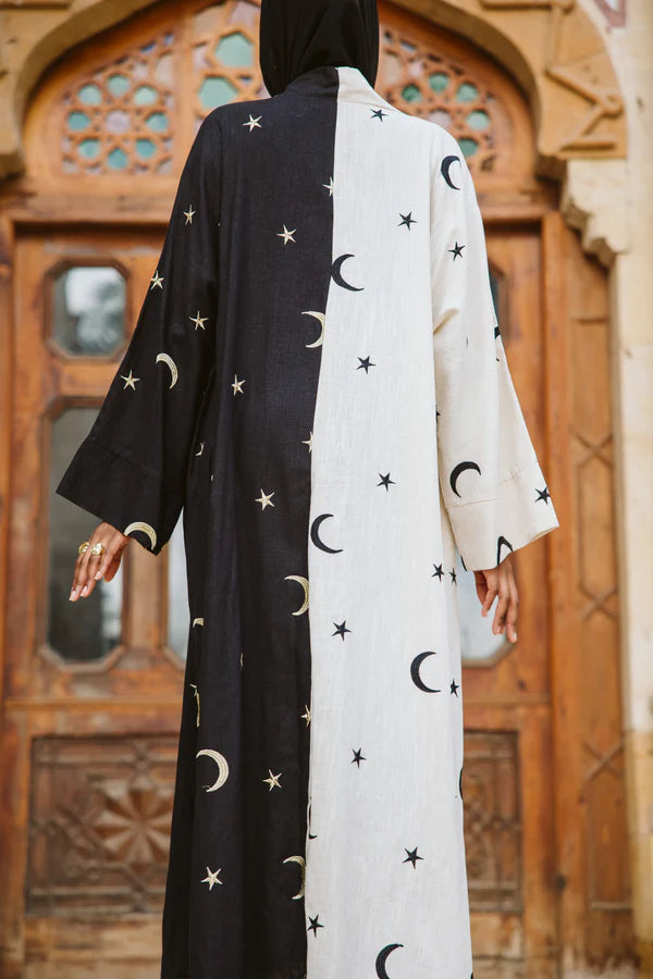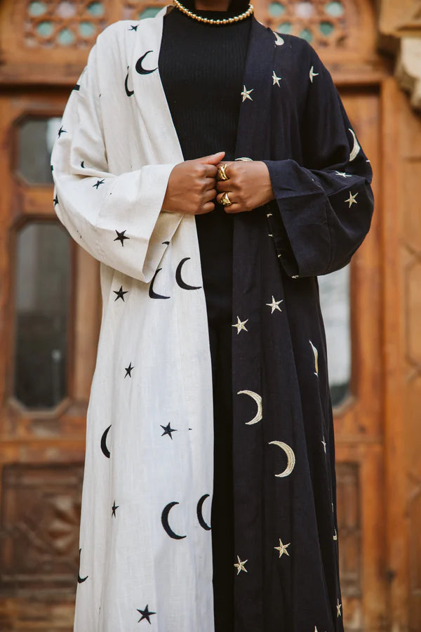 Embrace timeless elegance with this embroidered kaftan, featuring intricate detailing and a flowing silhouette. Perfect for sophisticated occasions and effortless style.