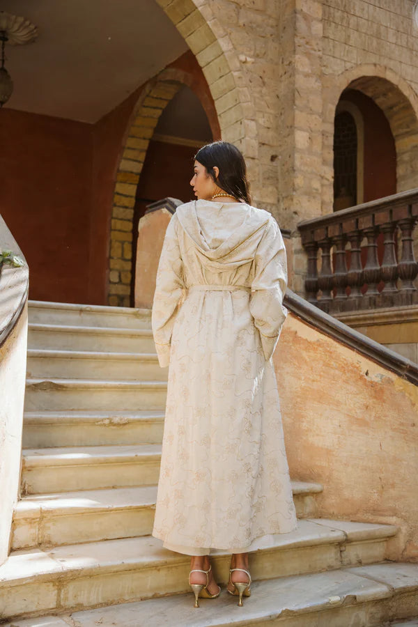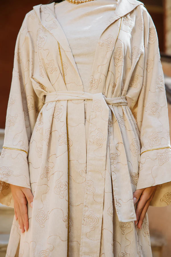 Elevate your wardrobe with this elegant embroidered kaftan, featuring intricate golden detailing and a flowing silhouette. Perfect for Ramadan gatherings or special occasions, this timeless piece blends tradition with modern sophistication.