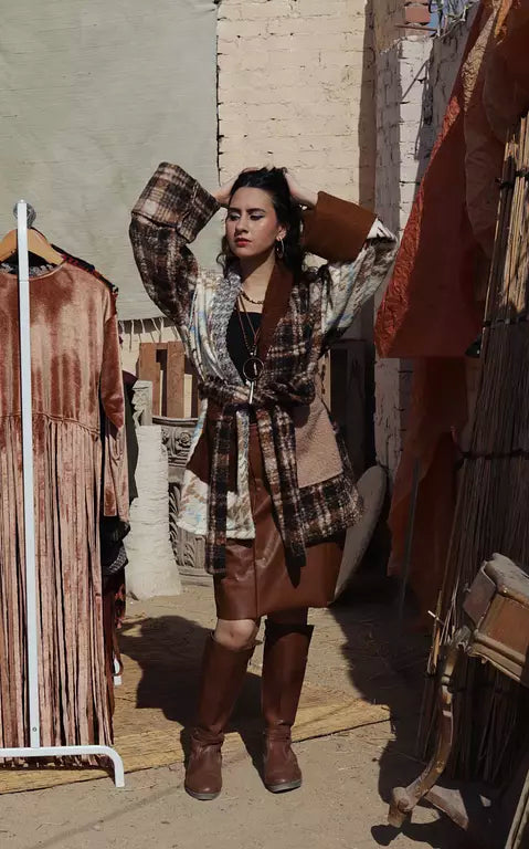 Textural detailing combines with knitted wool, boucle and tweed, two pockets on the front with an adjustable belt, can be worn on skirt and high boots or pants.