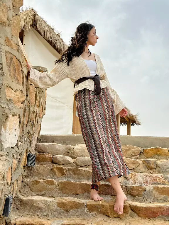 Model is wearing size one size fit up to XL, elastic waist, skirt length is 100cm, model size is S.