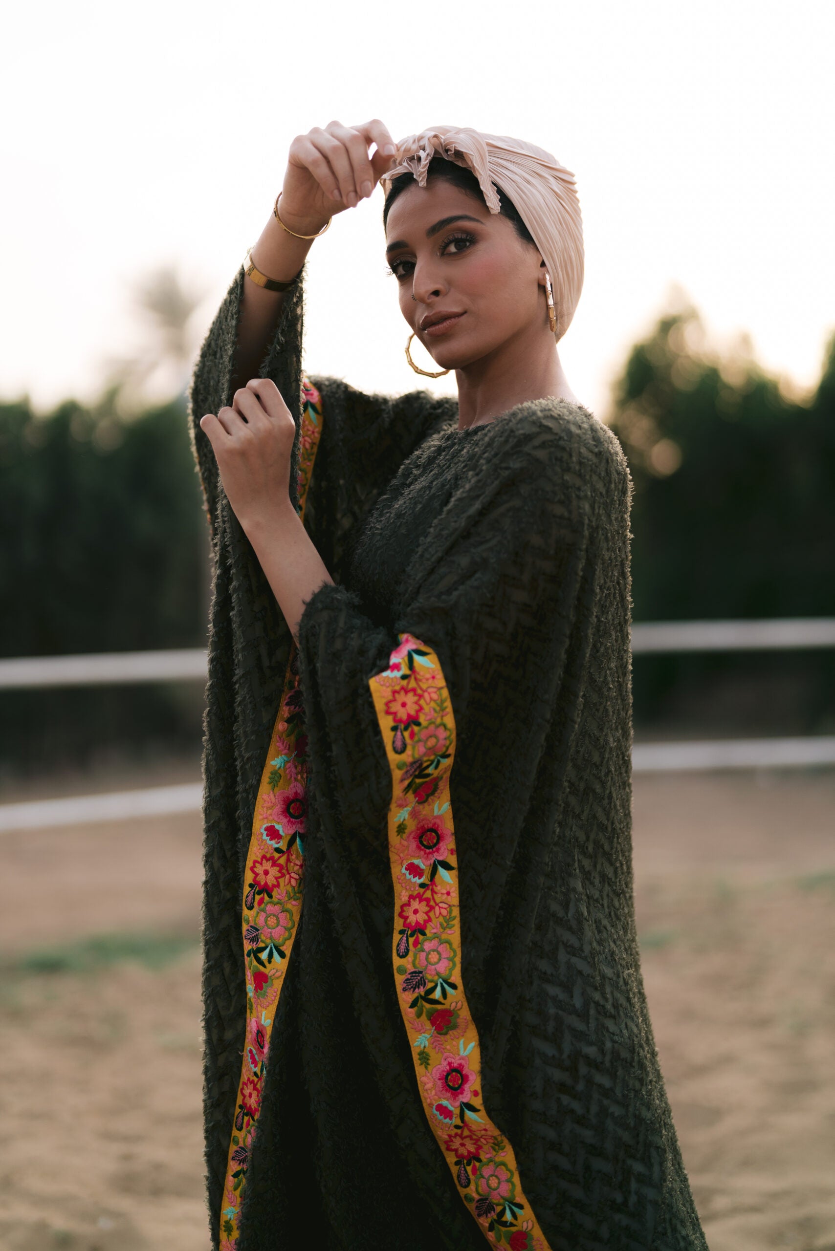 An olive-coloured textured chiffon Abaya with embroidered detailing on the sleeves