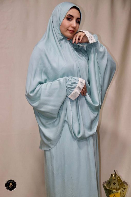 A soft cotton viscose khimar and skirt set with delicate lace trim at the hands. Practical, comfortable, and elegant for everyday wear