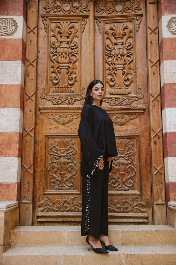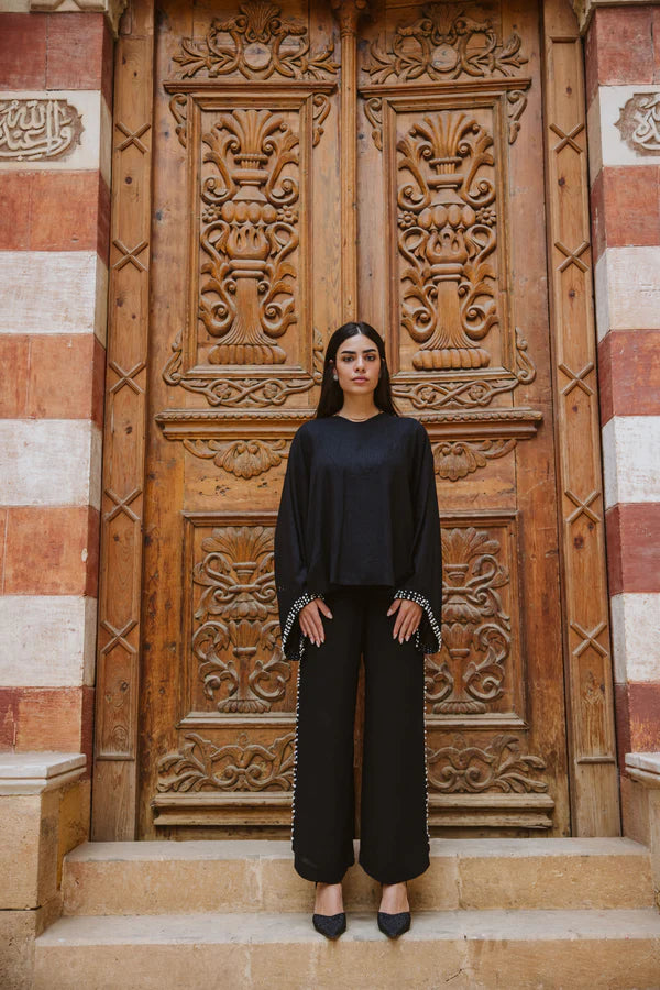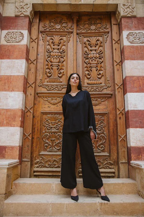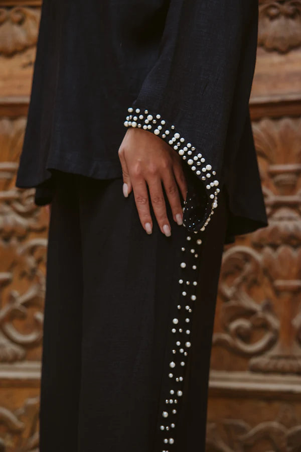 Effortlessly chic, this linen set is adorned with delicate pearl detailing for a touch of elegance. Perfect for refined everyday wear or special occasions.