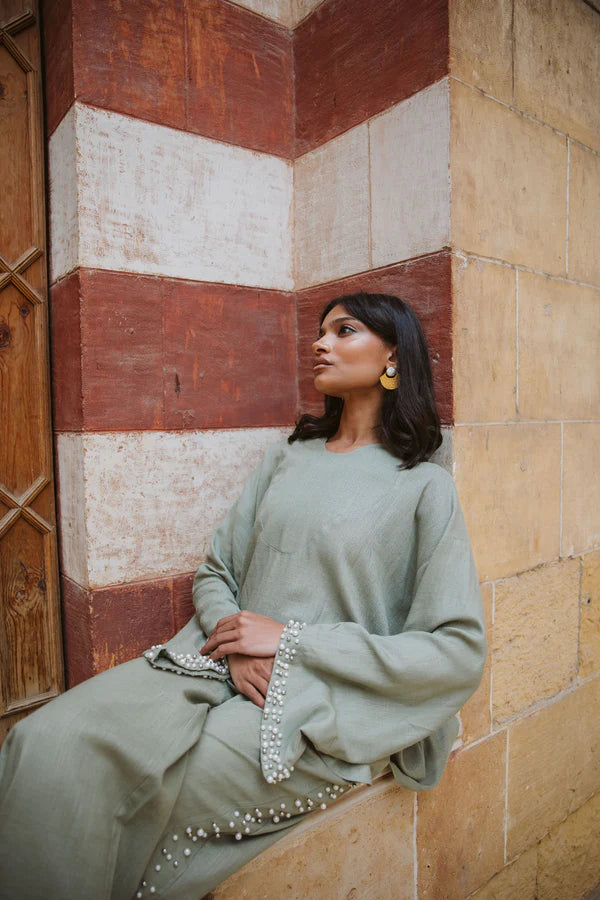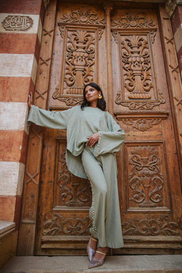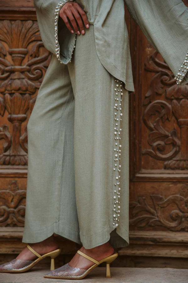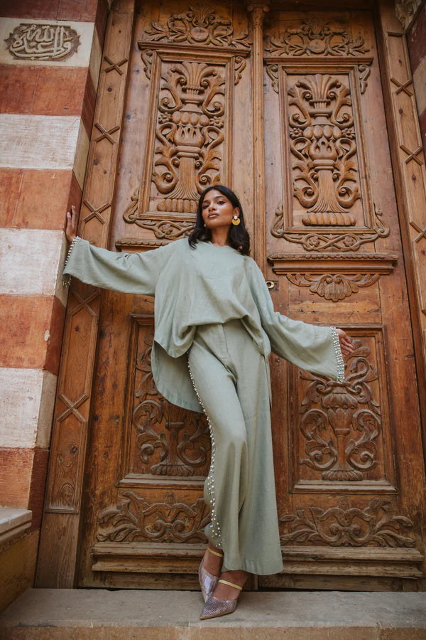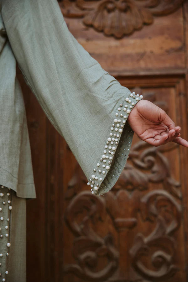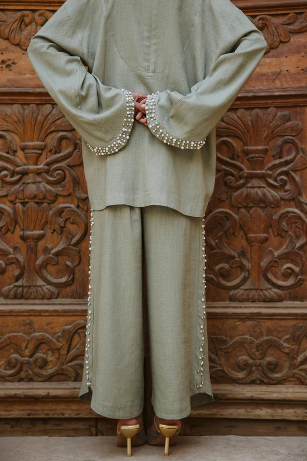 Effortlessly chic, this linen set is adorned with delicate pearl detailing for a touch of elegance. Perfect for refined everyday wear or special occasions.