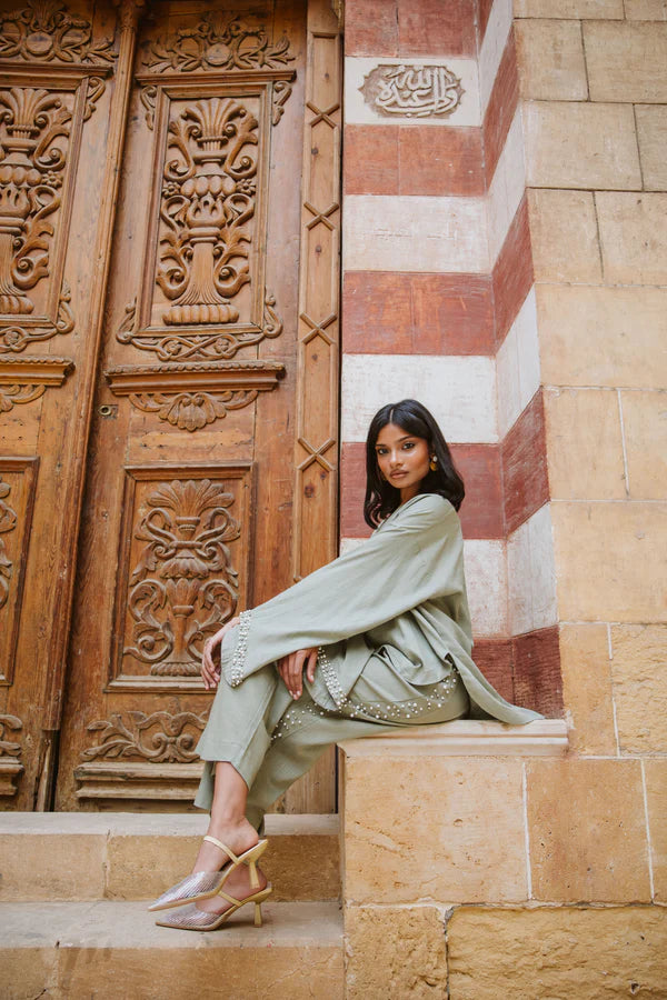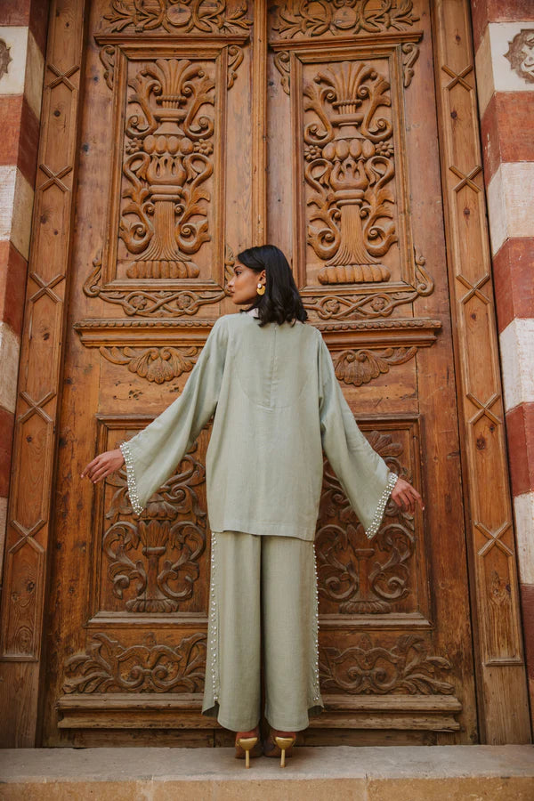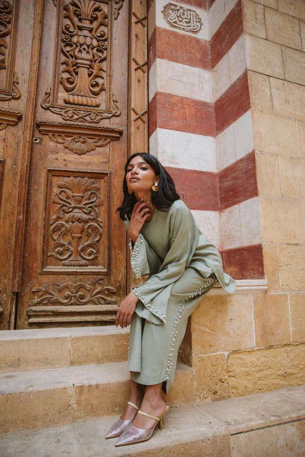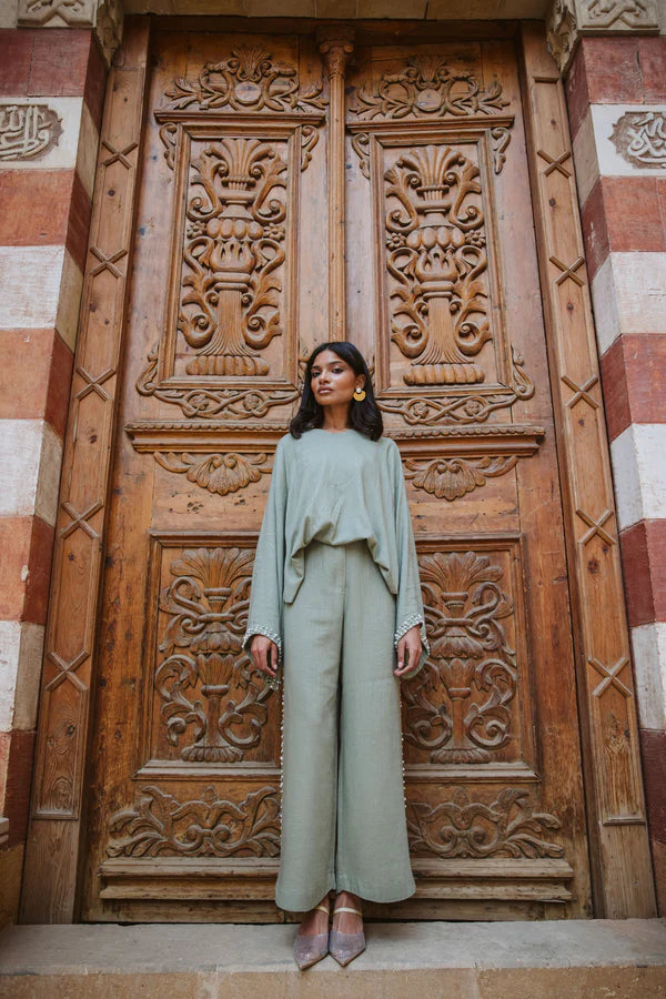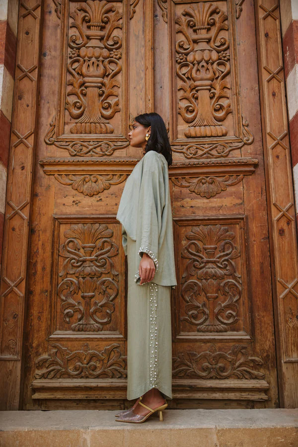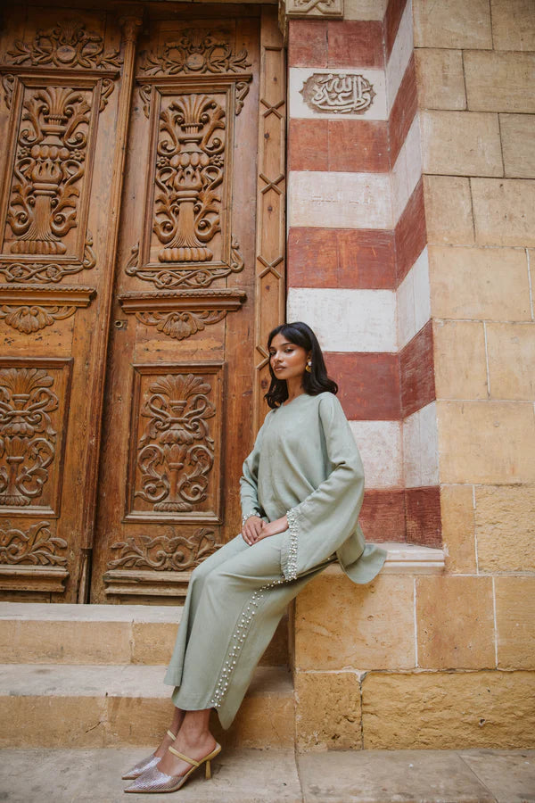 Effortlessly chic, this linen set is adorned with delicate pearl detailing for a touch of elegance. Perfect for refined everyday wear or special occasions.