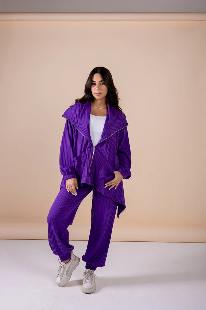 Material: Rib  Flow, stretchy and not transparent. Comes in pants and zipper asymmetrical jacket. SM to L...