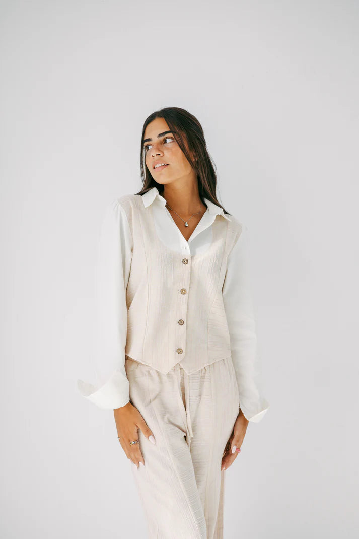 Our vest comes with an attached poplin chemise, comes in sizes SM and L XL