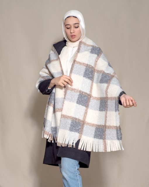 Add warmth and elegance to your winter wardrobe with this wool plaid knit shawl in a stylish combination of grey, baby blue, and café tones. This shawl features a heavy, thick fabric perfect for keeping you warm during cold days.